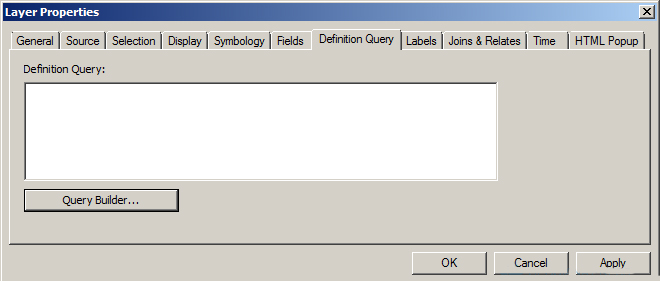 Click on definition query. Query expressions in arcgis adhere to standard sql expressions. With the layer selected in the contents pane under feature layer on the data tab in the definition query group click to open the layer properties dialog box with its definition query tab open.
